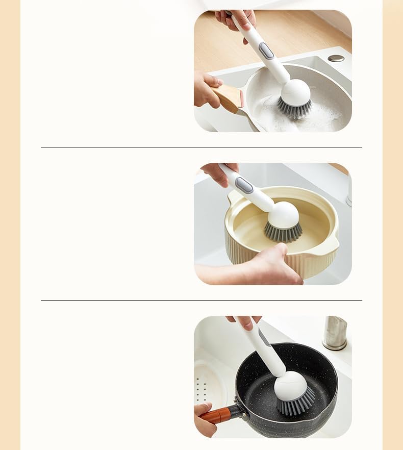 - Made from high-abrasion PET material that won’t deform or shed. Make dishwashing easier with this multi-function cleaning brush featuring a 6-level adjustable handle and built-in liquid dispenser