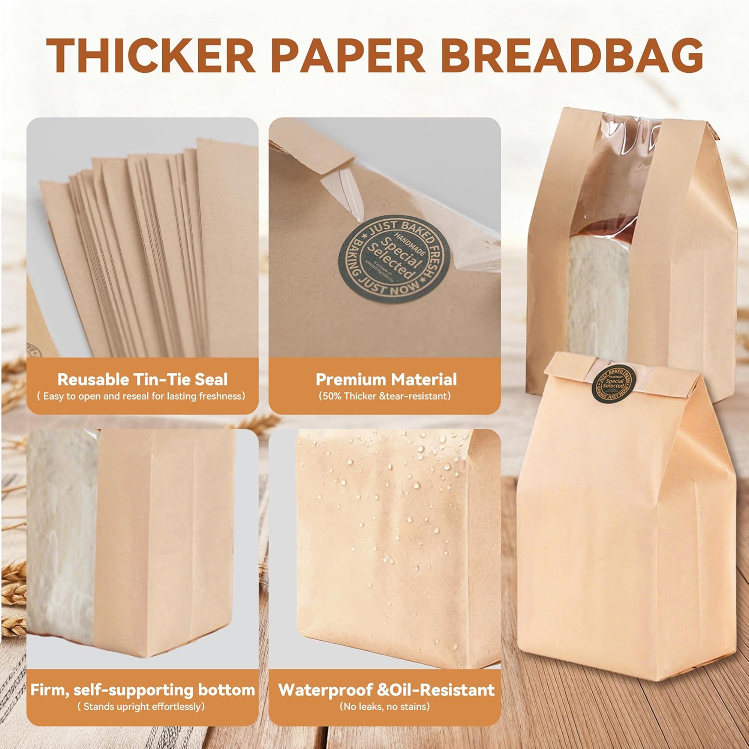 - 【Thicker Kraft Paper Bread Bags】 These premium bread bags feature easy open,50% thicker, tear-resistant construction with reinforced seams for daily durability. The firm square base requires no reshaping, just set it down for instant stability. The food-grade, waterproof and oil-resistant lining prevents leaks and stains. Clear windows on both front and side panels offer convenient visibility of contents.