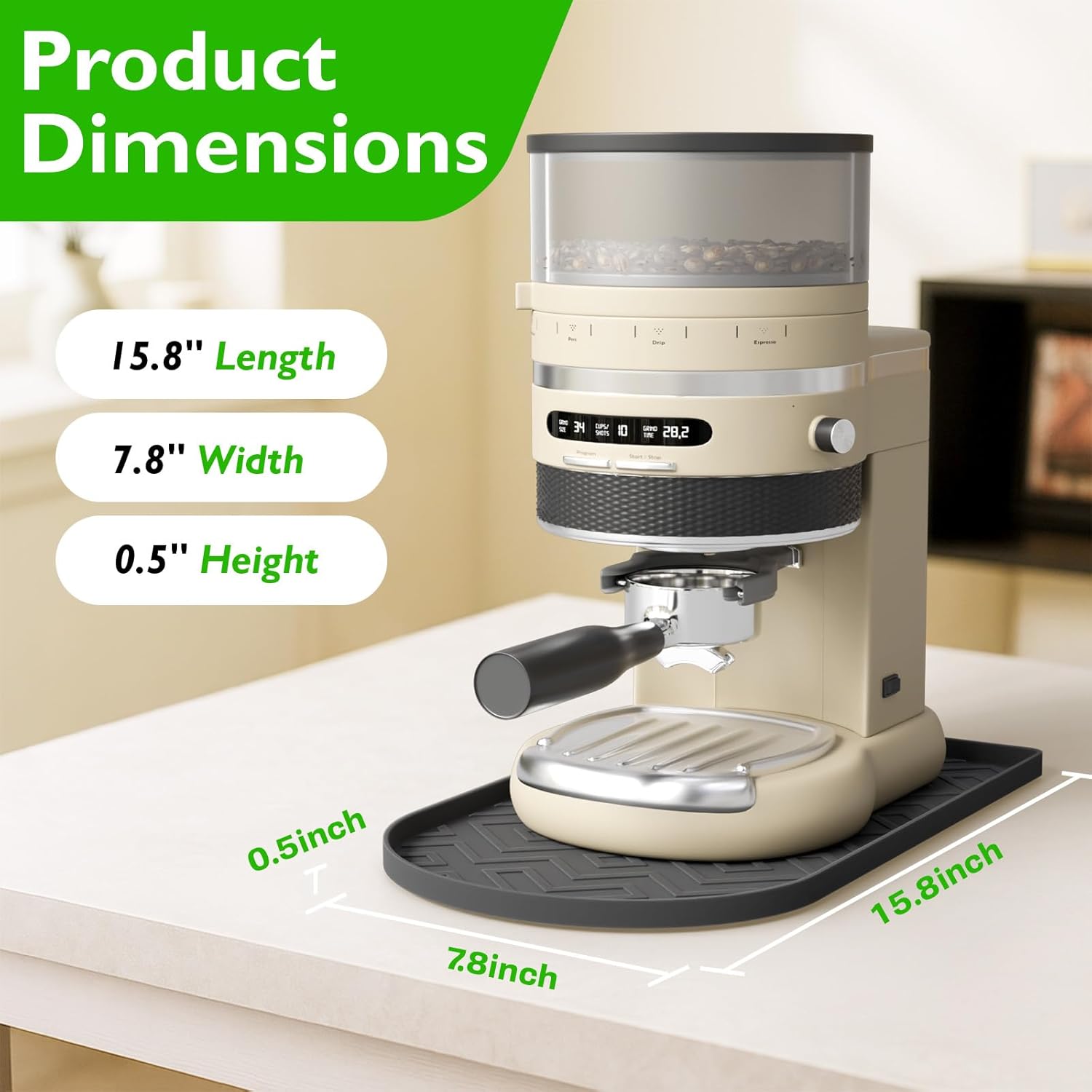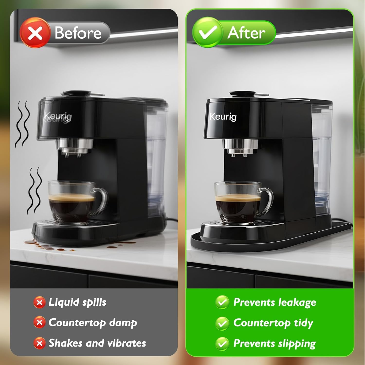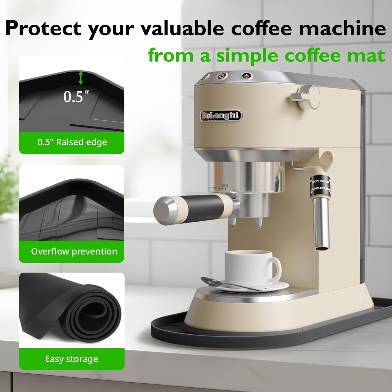 - Protect Counters & Appliances:Our coffee bar mat made of high-temperature resistant silicone (up to 446°F/230°C), it effectively absorbs heat from the coffee machine, avoiding thermal damage to wooden, marble, or quartz countertops. It also acts as a buffer against accidental spills, keeping both the counter and machine clean