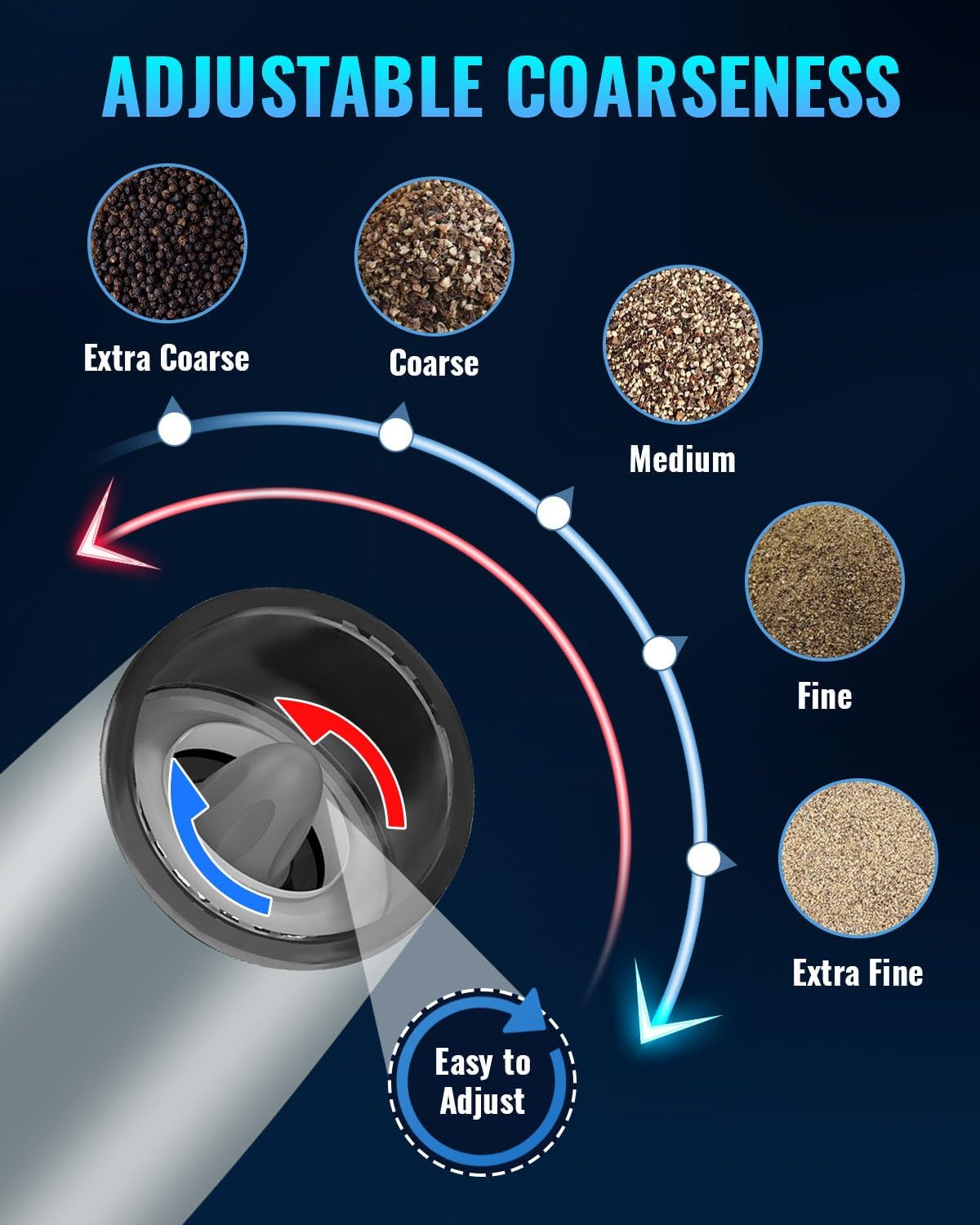 - 【ADJUSTABLE COARSENSESS】 Our electric salt or pepper grinder set just rotate clockwise to grind into fine grains and counterclockwise to grind into coarse grains. You can easily adjust the coarseness of spices according to your preference.