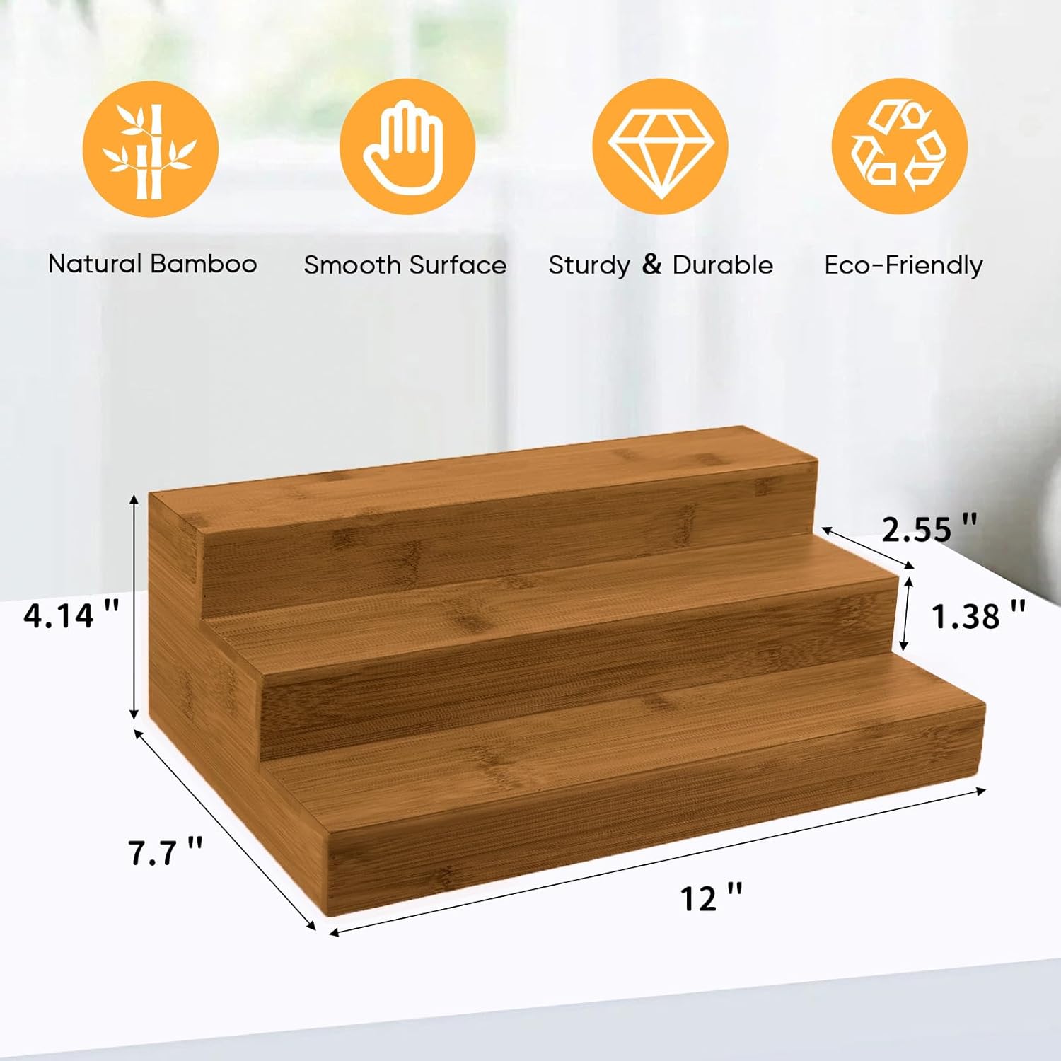 - 🌴Package: Includes 4 pack brown bamboo step rack. With the stepped design, you can find what you're looking for much faster, and maximize your cabinet or counter space.