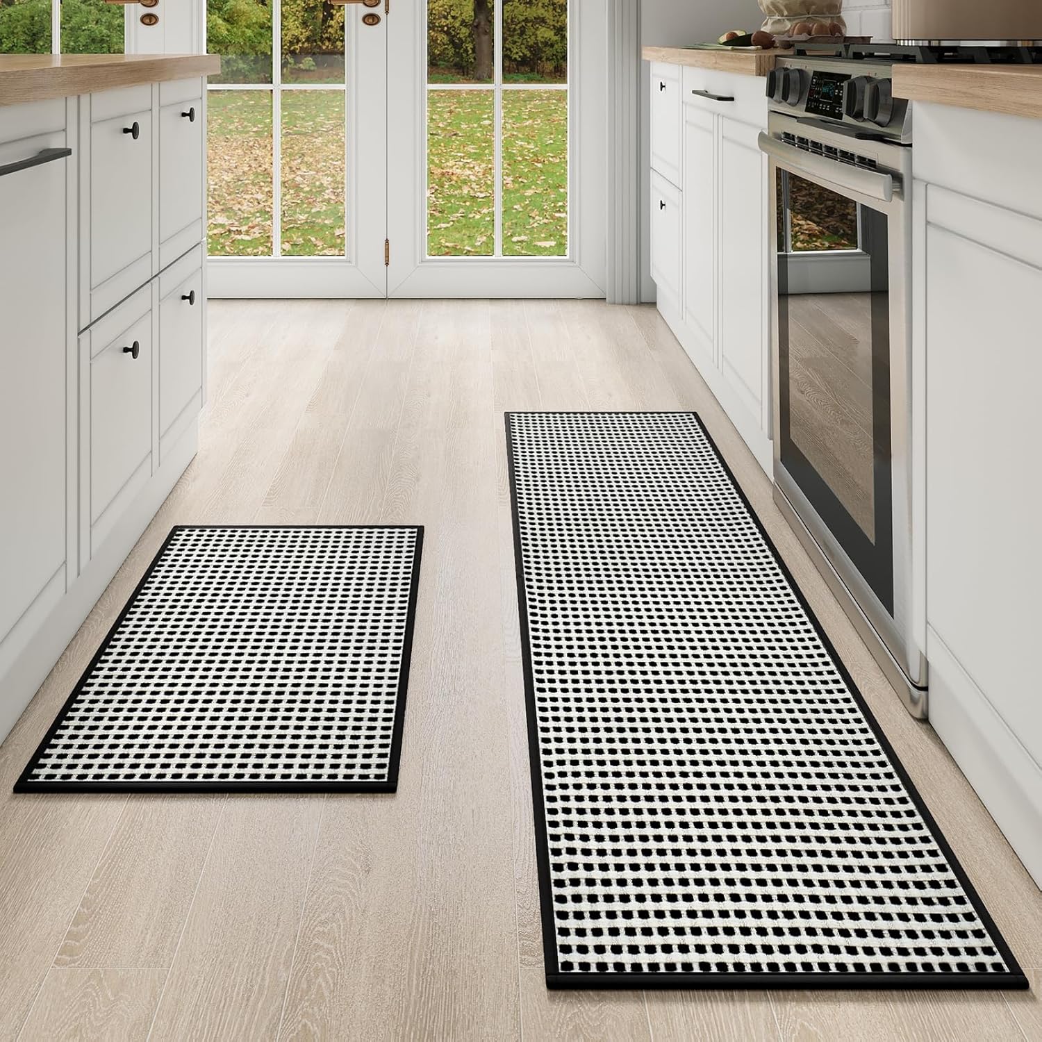 Kitchen Mat Kitchen Rugs Sets of 2 PCS Non Slip Washable, Super Absorbent Soft Braided Kitchen Mats for Floor, Rubber Backing Comfort Standing Kitchen Sink Mat Runner Rug, Black 17"x28"+17"x59"