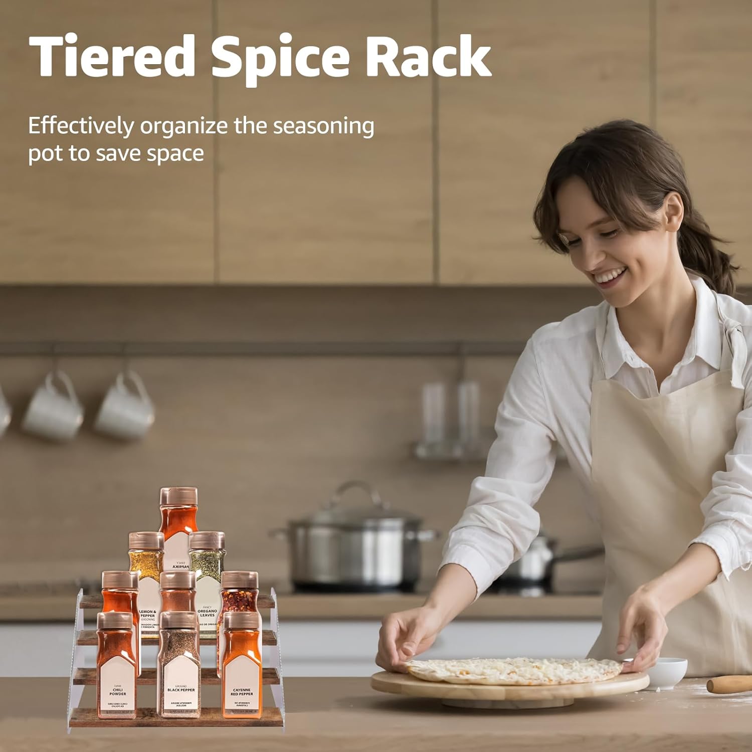 nianfeng Tiered Spice Rack, 4-Tier Spice Pantry Kitchen Cabinet Organizer, 12-Inch, Natural Wood Acrylic Stair Riser Stand, Countertop Seasoning Shelf (Rustic Brown)